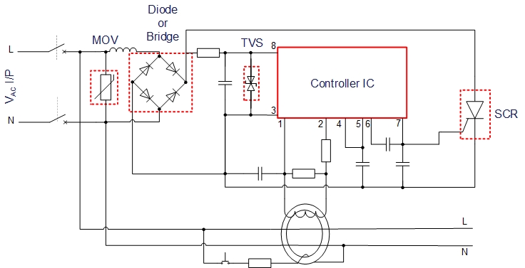 input AC-line,controller IC (IC)which oversees the overall operation of RCCB application circuit,execution
