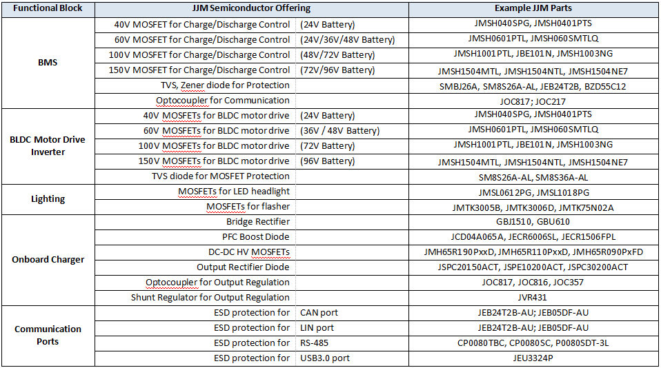 Electric two-wheelers require highly efficient and reliable semiconductor devices across BMS, motor drive, charging, lighting, and auxiliary subsystems. JJM offers complete MOSFET, diode, and protection component solutions that meet performance and safety requirements for the e-two-wheelers market.